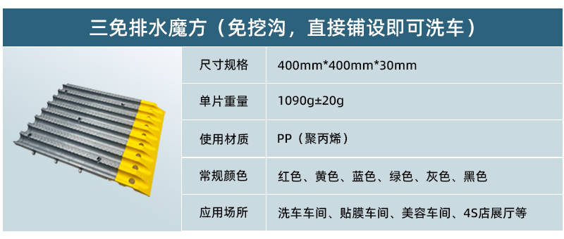 1、免挖溝,直接鋪設(shè)即可洗車。 2、免清淤,泥沙順自有排水溝直接排走。 3、免防水,接口處打防水膠后徹底防漏水。 4、非常耐用,容易清理、耐油脂、酸和化學(xué)品。 5、極佳承重載力,適合高人流量及轎車通過(guò)場(chǎng)所。
