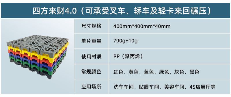 1. 分為3.4.5.厚度,解決不同厚度,統(tǒng)一紋路的問題 2. 啞光平紋設(shè)計(jì),防滑,美觀,易清潔 3. 選用高級原料,加入其他輔料,顏色亮麗,無異味,無污染 4. 顏色為紅黃藍(lán)綠黑灰六色,滿足客戶用色需求,搭配屬于自己的風(fēng)格 5. 通扣鎖扣設(shè)計(jì),容易鋪設(shè)且容易拆卸打理 6. 加強(qiáng)支撐,不容易出現(xiàn)壓壞壓斷現(xiàn)象,滿足大多數(shù)車輛施工的要求 7. 使用年限長,五年超長質(zhì)保,使用無后顧之憂 8. 十字支撐,保證承載最大化的同時(shí),且易排泥排水