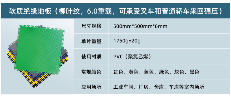5、高承載,更防滑: 軟質(zhì)絕緣地板為實(shí)心結(jié)構(gòu),只要地面承重沒有問題,其承載能力能夠達(dá)到每平米10噸以上。地板表面在生產(chǎn)過(guò)程中帶有