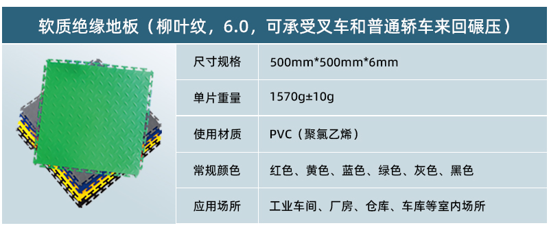 6、色彩絢,易搭配: 軟質(zhì)絕緣地板常規(guī)顏色為紅色、黃色、黑色、灰色、藍色、綠色等顏色,也可根據(jù)客戶的要求進行色彩的調(diào)整。正方形